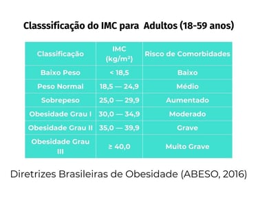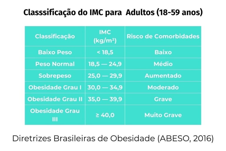 Tabela para Adultos (20-59 anos): A classificação para adultos relaciona cada faixa de IMC com níveis crescentes de risco de comorbidades. Pessoas abaixo do peso (IMC < 18,5) têm baixo risco para doenças relacionadas à obesidade, mas enfrentam riscos aumentados para outras condições como anemia, osteoporose e deficiências imunológicas. O sobrepeso (IMC 25,0-29,9) marca o início de um risco aumentado para diabetes, hipertensão e doenças cardiovasculares. As três categorias de obesidade representam riscos progressivamente maiores: moderado na obesidade grau I, grave na grau II, e muito grave ou muitíssimo elevado na grau III, quando complicações severas tornam-se significativamente mais prováveis e intervenções médicas intensivas frequentemente se fazem necessárias.